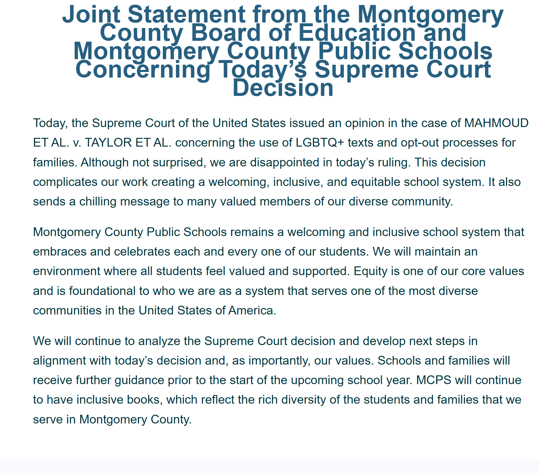 During the 2022-23 school year, Montgomery County changed the curriculum to include more inclusive literature at all grade levels. According to the Mahmoud opinion, “Those texts included five ‘LGBTQ+-inclusive’ storybooks approved for students in kindergarten through fifth grade, which have story lines focused on sexuality and gender.” When parents complained, the school board allowed parents to opt their children out of class on the day those books would be taught. This was done as a reasonable accommodation for religious beliefs. But after the school board became overwhelmed with opt out requests, they rescinded this policy. So some parents sued, and this case made its way to the Supreme Court.