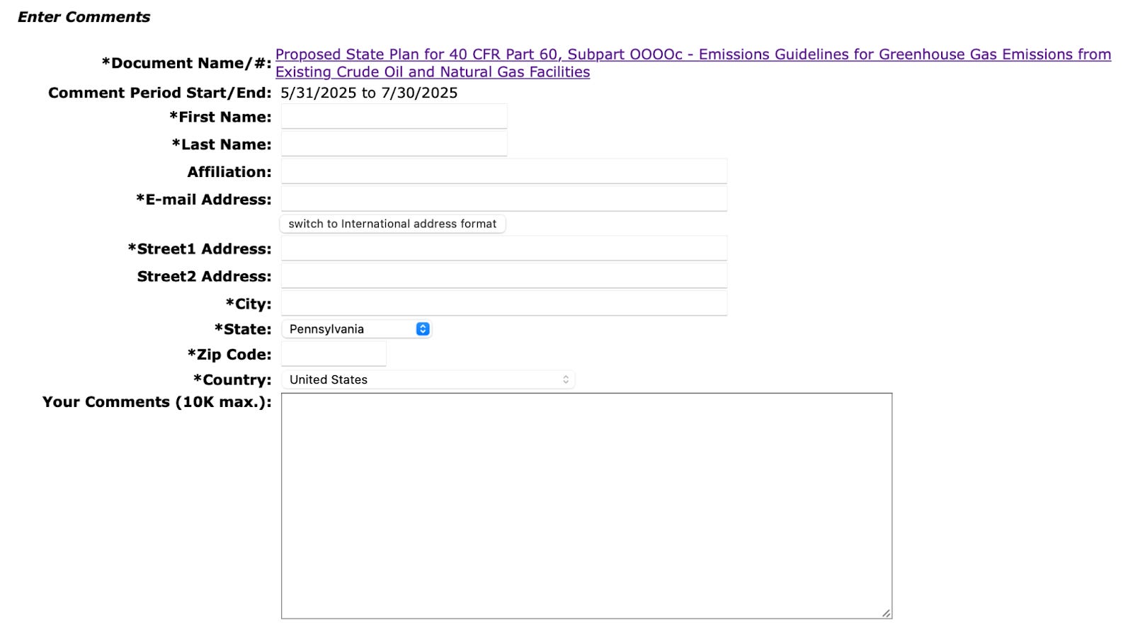 Go to the above link and look for Proposed State Plan for 40 CFR Part 60, Subpart OOOOc - Emissions Guidelines for Greenhouse Gas Emissions from Existing Crude Oil and Natural Gas Facilities under “Open Comment Periods”